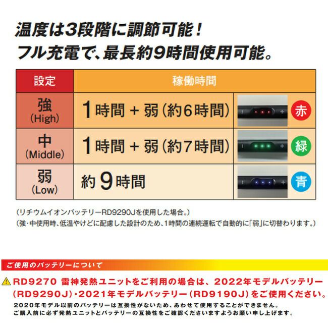 7.温度は3段階に調節可能。フル充電で、最長約9時間使用可能。