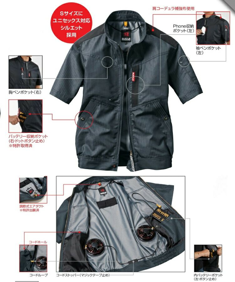 スタイリッシュ な ライダーズ デザイン ! 空気 漏れ を 防ぐ 高密度 ヘリンボーン 素材 を 採用 ! 男女 ユニセックス モデル バートル BURTLE 空調服 【AC1056】 エアークラフト 半袖 ブルゾン