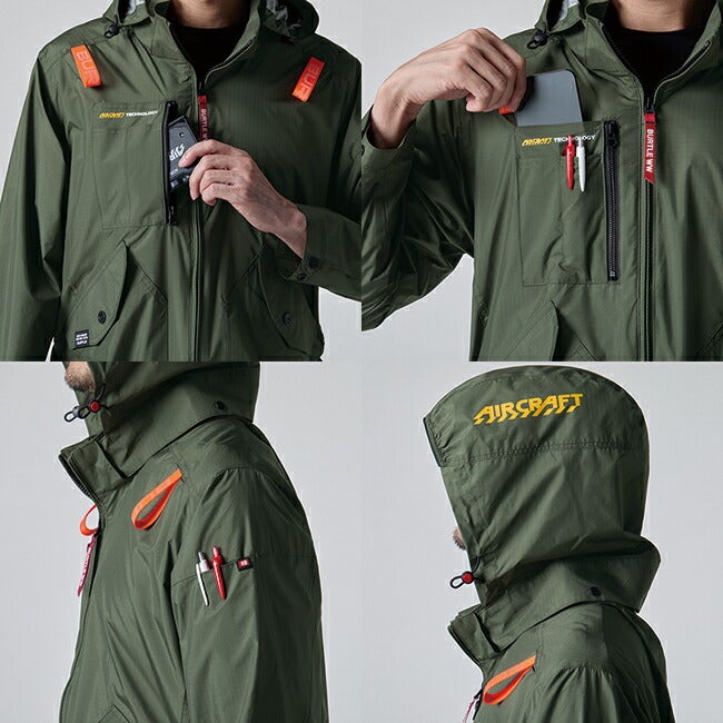 ★ヘルメット収納フード(着脱可能)、フックハンガー、背ランヤードホールを配備しフルハーネスに完全対応