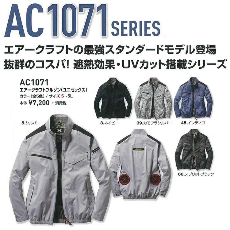 エアー クラフト の 最強 スタンダード モデル ! 抜群 の コスパ と 遮熱 効果 UVカット 搭載シリーズ! 男女 ユニセックス モデル バートル BURTLE 空調服 【AC1071】 エアークラフト 長袖 ブルゾン