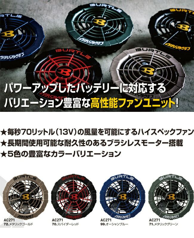 他の画像を見る パワーアップしたバッテリーに対応するバリエーション豊富な高性能ファンユニット バートル BURTLE 空調ウェア ファンセット(カラー) 【AC271】 定価 ¥ 12,100 販売価格 ¥ 5,830 税込 在庫切れ カートに入れる お気に入りに登録する
