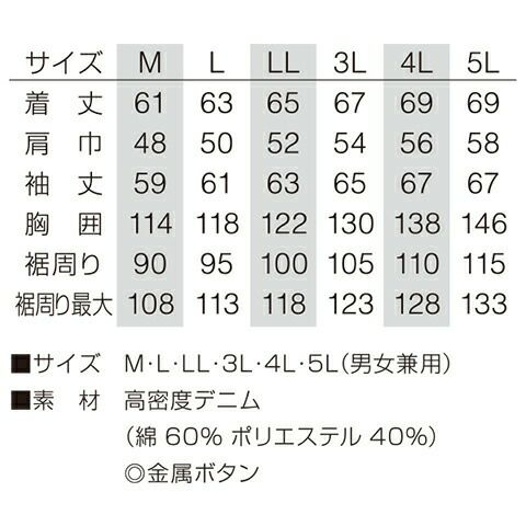 素材   : 高密度デニム(綿 60% ポリエステル 40%)
