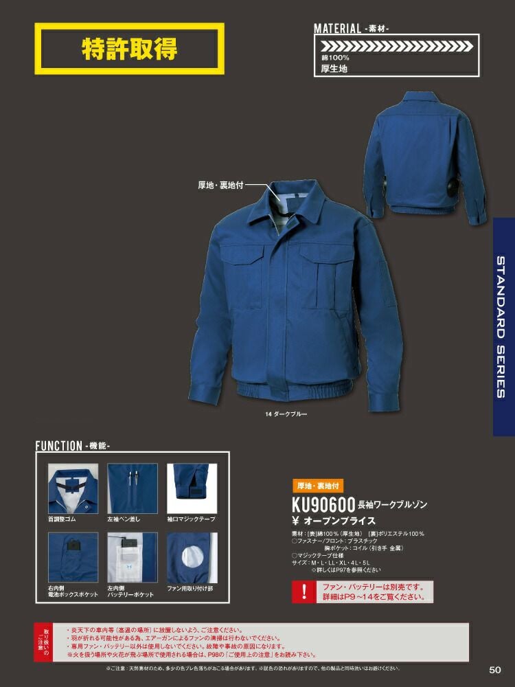 綿100%の厚地で、ハードな現場でも涼しく作業できるベーシックウェア! 【24V 2025年 GLOBALバッテリー&ファン付き】サンエス SUN-S 空調 風神服 KF90600 長袖ワークブルゾン厚生地 裏:ポリエステル100% | 風神 カジュアル おしゃれ 綿 100% KU90600