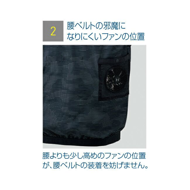 腰よりも少し高めのファンの位置が、腰ベルトの装着を妨げません。