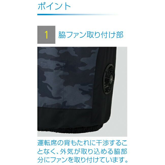 運転席の背もたれに干渉することなく、外気が取り込める脇部分にファンを取り付けています。