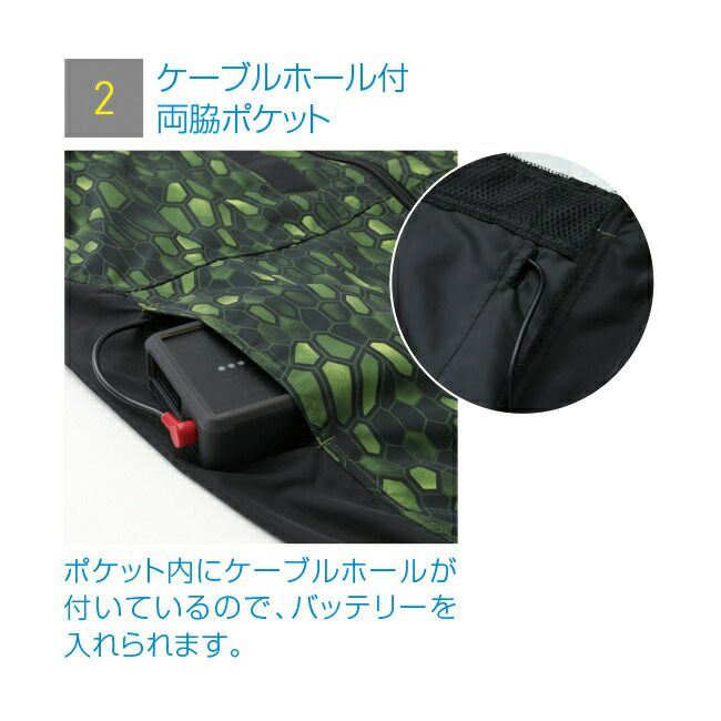 ポケット内にケーブルホールが付いているので、バッテリーを入れられます。