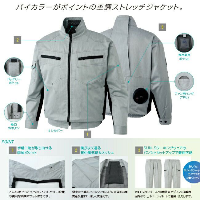 バイ カラー が ポイント の 杢 木目 調 の ストレッチ ジャケット 【24V 2025年 日本製バッテリー&ファン付き】サンエス SUN-S 空調風神服 KF93900 長袖 ブルゾン | 新モデル 新色 UVカット 胸 ポケット ベスト メッシュ マジック パターン 涼しい 夏 夏用 おしゃれ カジュアル メンズ レディース KU93900