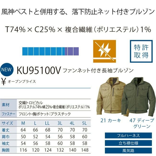 風神 ベスト と 併用 する 脱落 防止 ネット 付き ブルゾン 【24V 2025年 GLOBALバッテリー&ファン付き】サンエス SUN-S 空調風神服 KF95100V ファン ネット 付き 長袖 ブルゾン | 新モデル 新色 夏 猛暑 酷暑 熱中症 涼しい 空調 おしゃれ カジュアル かっこいい 高所 フック 制電 ポリエステル 綿 複合 繊維 KU95100V