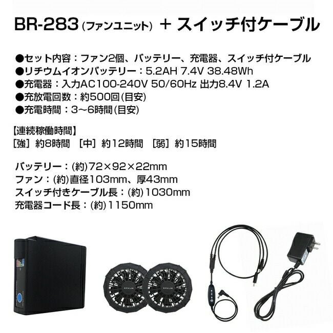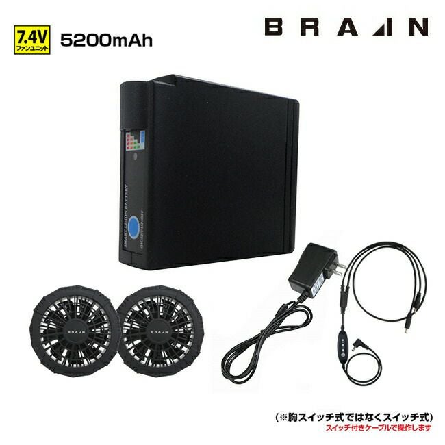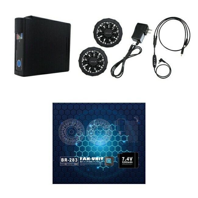 【セット内容】 ファン×2個、BR-003バッテリー、スイッチ付ケーブル、充電器