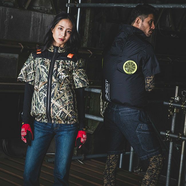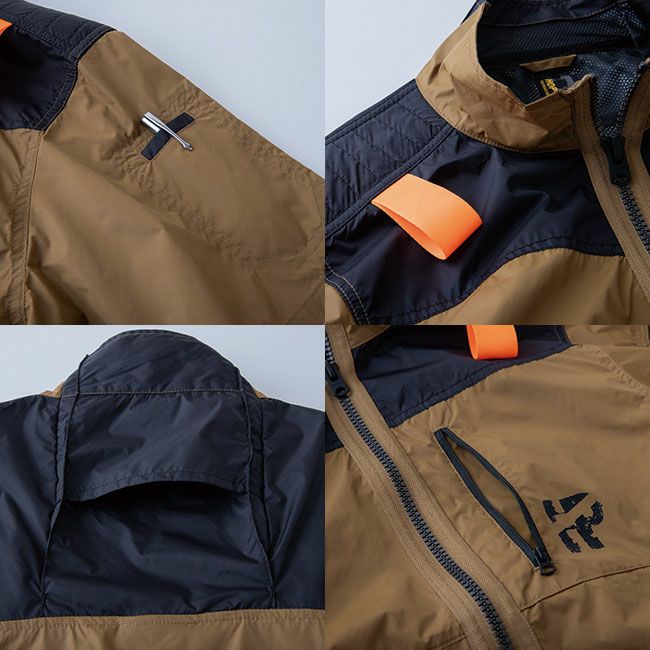 背面にはフルハーネス対応用にランヤード通し口があり、前面にハーネス着用時にも使用しやすい縦型ポケットをデザインしました。裏チタンコーティングにより紫外線遮蔽率97.7%(UPF50%)のUVカット性能があり猛暑時には暑さも和らげます。