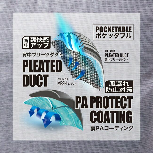 背中のプリーツダクトは風抜け爽快感を高める構造で豊かな快適性を確保。