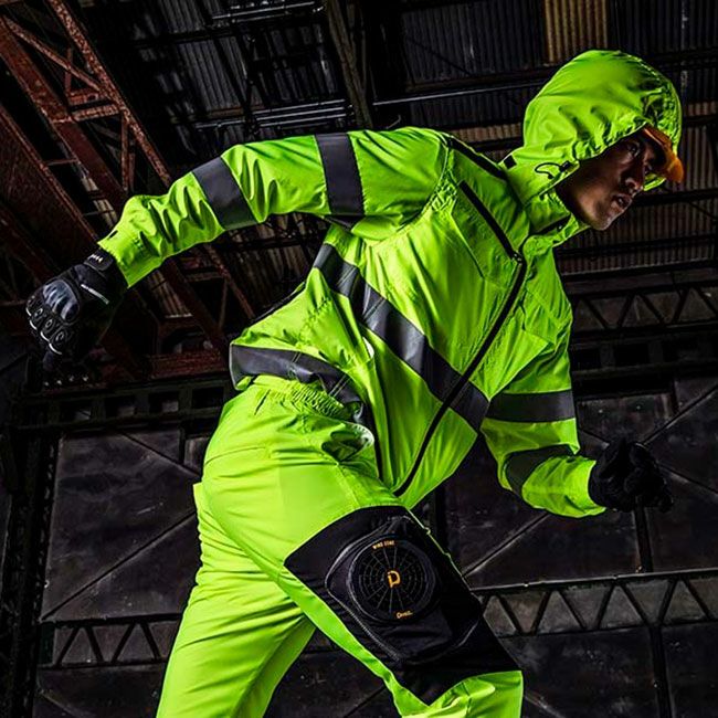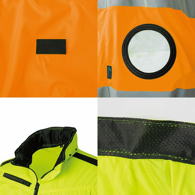 反射テープにはJIS T8127に適合したオラフォルジャパン社製ガラスビーズ再帰反射材を使用。衿、帯、台座シート裏には抗菌防臭SEKメッシュを使用、フード収納式から脱着式へとアップグレードし背中のダクトの風抜けなど細部にまでこだわり、ジャケット・ベストは裾マジックテープ調整可能、反射デザインファスナーテープ、外ポケットにバッテリーを入れて使えるケーブル通し穴装備。