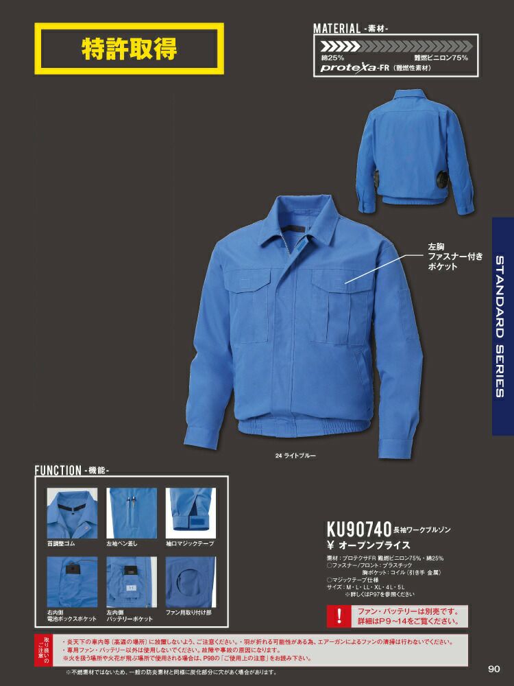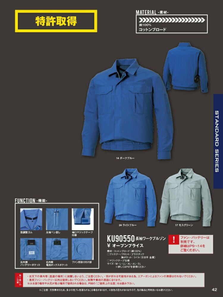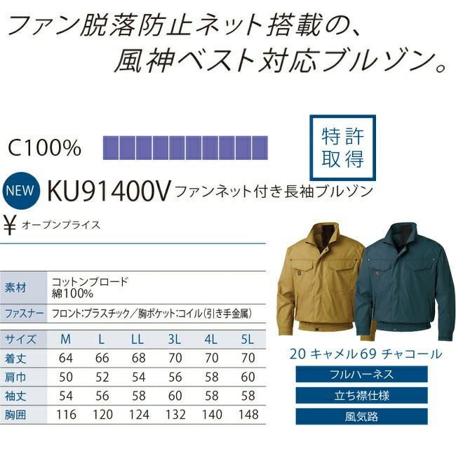 ファン 脱落 防止ネット 搭載 の 風神 ベスト 対応 ブルゾン 【24V 2025年 GLOBALバッテリー&ファン付き】サンエス SUN-S 空調風神服 KF91400V ファン ネット 付き 長袖 ブルゾン | 新モデル 新色 メンズ レディース 夏 猛暑 酷暑 熱中症 涼しい 空調 おしゃれ カジュアル かっこいい 高所 フック 制電 綿 綿100% KU91400V