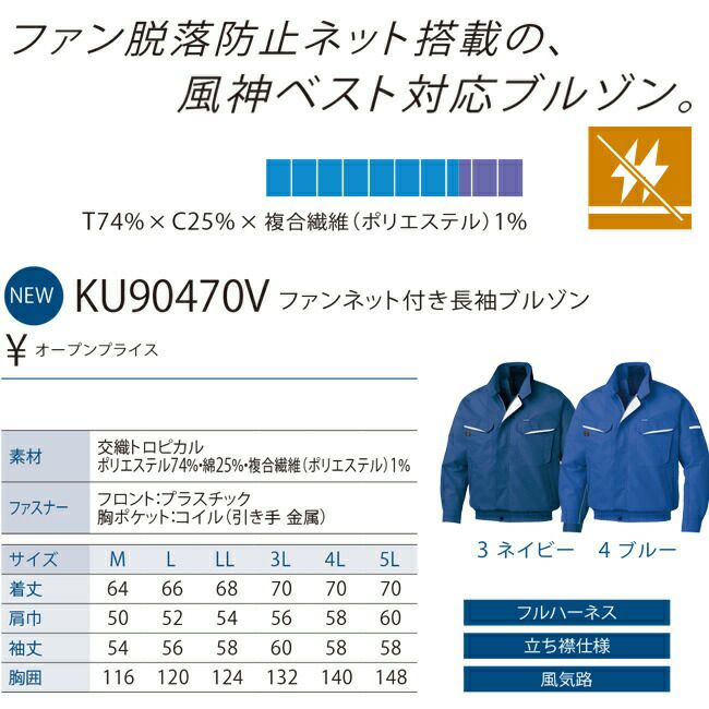 ファン 脱落 防止ネット 搭載 の 風神 ベスト 対応 ブルゾン 【24V 2025年 GLOBALバッテリー&ファン付き】サンエス SUN-S 空調風神服 KF90470V ファン ネット 付き 長袖 ブルゾン | 新モデル 新色 夏 猛暑 酷暑 熱中症 涼しい 空調 おしゃれ カジュアル かっこいい 高所 フック 制電 ポリエステル 綿 複合 繊維 KU90470V