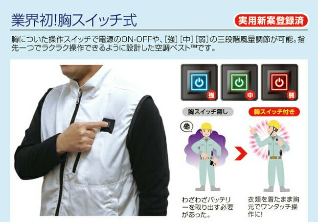 ● 空調ベストの胸スイッチタイプが登場!従来はわざわざバッテリーを出してON/OFF/風量調整を行っていましたが、それらの操作がすべて胸のスイッチだけで行えます。バッテリーを取り出して操作する必要がありません。胸スイッチで強・中・弱、電源ON/OFFが可能です。スイッチが光るので風量もすぐにわかります。