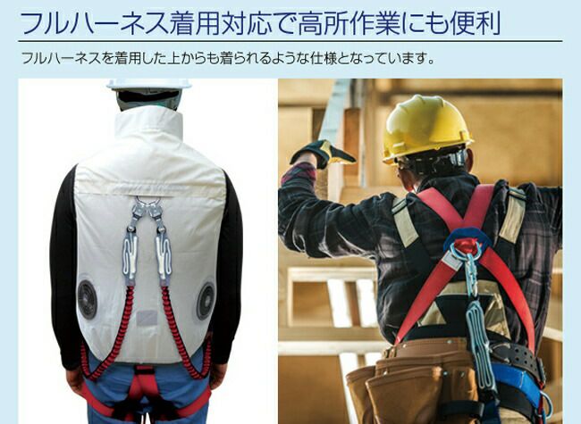 ● フルハーネス着用にも対応。フルハーネスを着用した上から着られます。背中部分はチャック式になっており、安全帯ランヤードを通せるようになっています。使用しない時は、チャックが隠れる仕様。長袖を着用しない現場におすすめです。