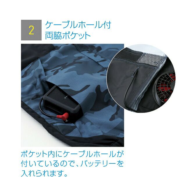 ポケット内にケーブルホールが付いているので、バッテリーを入れられます。