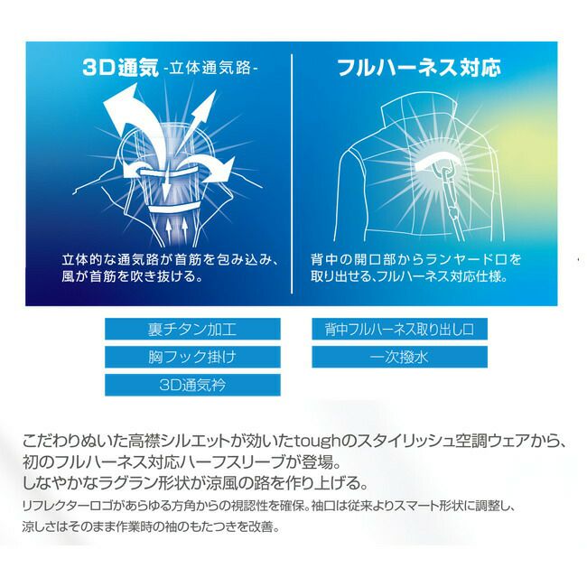 こだわりぬいた高襟シルエットが効いたtoughのスタイリッシュ空調ウェアから、初のフルハーネス対応ハーフスリーブが登場。