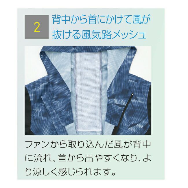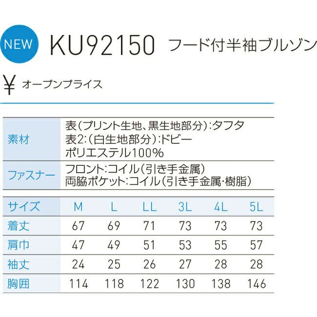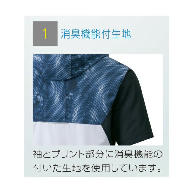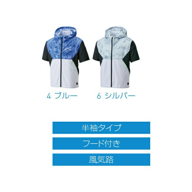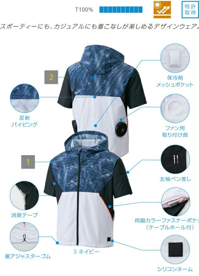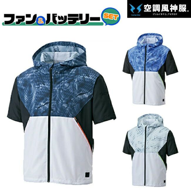 スポーティー にも、 カジュアル にも 着こなし が 楽しめるデザインウェア 【2022年ファン&バッテリーセット付】サンエス SUN-S 空調風神服 KF92150 フード 付き 半袖 ブルゾン KU92150