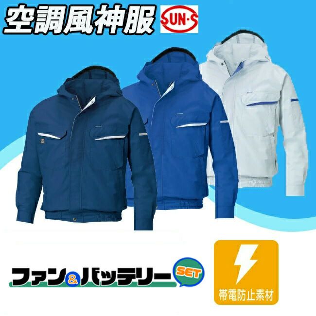 型崩れしにくく、涼しい空気を逃がさない!大人気の定番 ! 【2022年ファン&バッテリーセット付】サンエス SUN-S 空調 風神服KF90480 フード付き長袖ブルゾンフード付き 帯電防止素材 WA10470シリーズパンツ対応