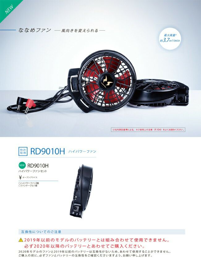 空調風神服 2020年 最新モデル ななめ型 ファン 空調 空調服 サンエス SUN-S 【RD9010H】 空調風神服 用 ハイパワー ななめ ファン セット