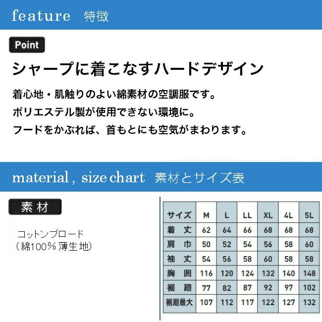 他の画像を見る 綿100%がポイント。フード付きでヘルメット作業も快適。 【空調服(R)】フード付綿薄手長袖ブルゾン(バッテリーセット)KU91410 販売価格 ¥ 20,327 税込 カートに入れる お気に入りに登録する