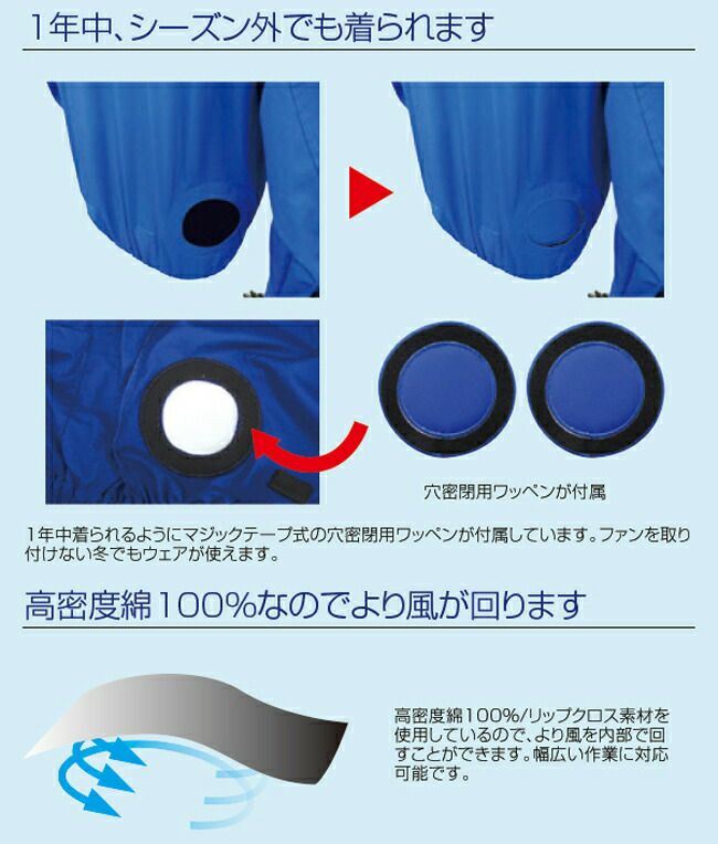 ● 夏だけでなくファンを装着しない季節にも着用できるように、穴をふさぐマジックテープ式のワッペンを付けております。ウェアの内側から付けることができるようになっています。