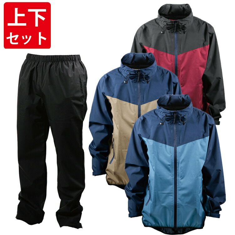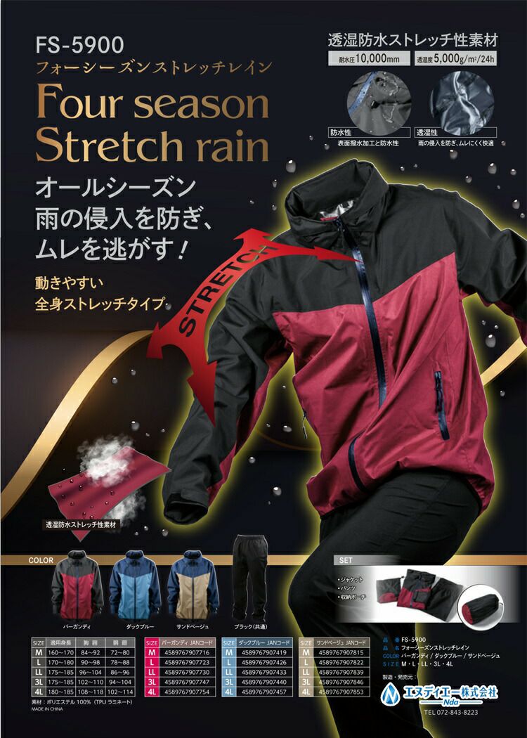 耐水圧 10000mm 透湿度 5000g/m2/24h の高性能 ストレッチ レイン ウェア 収納 ポーチ 付き 【上下セット】フォーシーズン ストレッチ レインウェア FS-5900