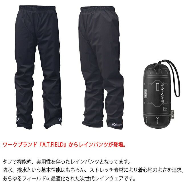 新世紀 エヴァンゲリオン との コラボ レインウェア 撥水 機能 と ストレッチ 素材 で タフ で 着心地 の いい レインパンツ 専用 の カプセル型 防水バッグ 付き エヴァンゲリオン コラボ レインパンツ 【ATF-01P】 A.T.FIELD