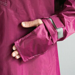 ポンチョといえば、袖の下をスナップボタンで留めて袖部分のばたつきを防ぐイメージですが、 このレインポンチョは、ムササビのようなドルマンスリーブになっているので歩くときの手を振る動作、 自転車乗車時の前かがみの動作にしっかりついてきます。徹底的に防水にこだわったレインウェアです。