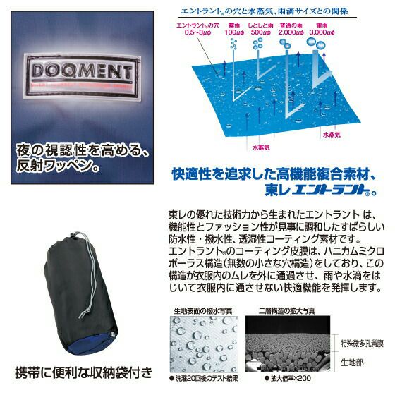 日本品質の高い撥水・防水・透湿性を兼ね備えた、東レのエントラントを使用したレインコートです。