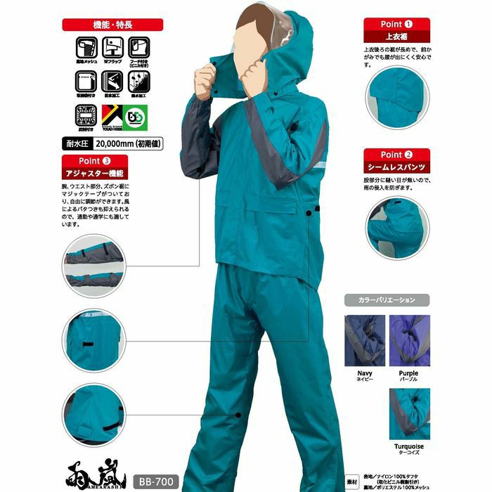 腕、ウエスト部分、ズボン裾にマジックデープがついており、自由に調節ができます。風によるバタつきも抑えられるので、通勤や通学にも適しています。