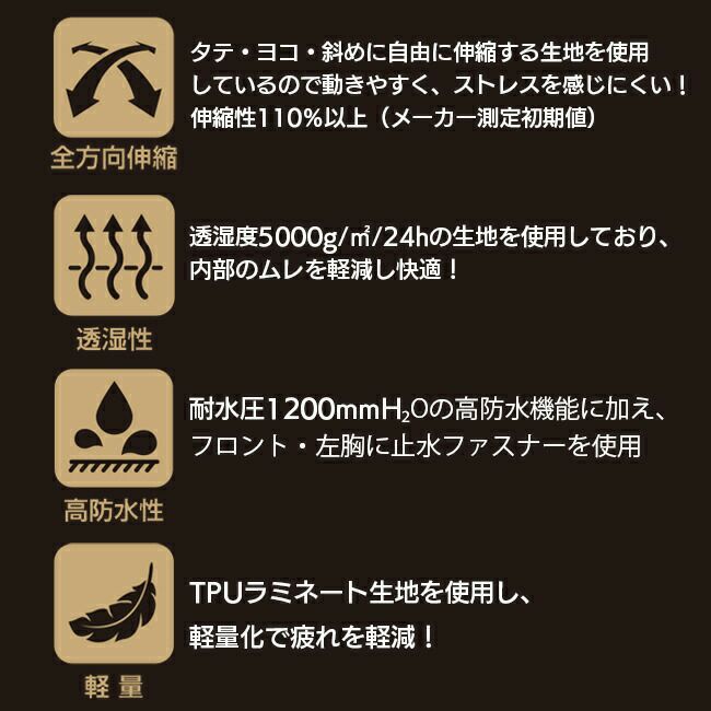 耐水圧12000mm以上。水の侵入を防ぎ衣類内のムレを軽減!