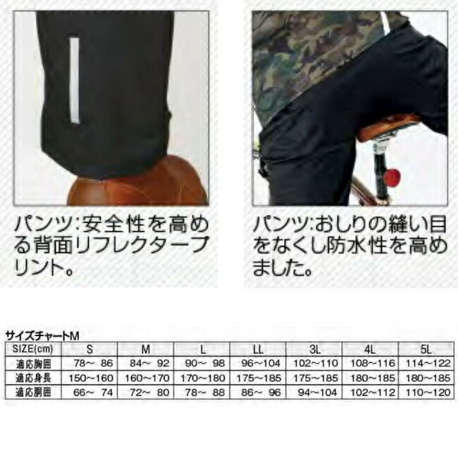 仕様:防水 / 撥水 / 透湿 / リフレクター / 高ストレッチ性 / 背面反射プリント / ウエスト調節機能 / 両脇ポケット / オールシーズン