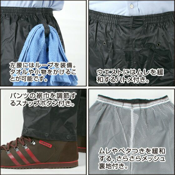 このレインパンツのポイントは、左腰に付いているタオルハンガー。作業中に手の汚れを拭いたりするのにとっても便利です。
