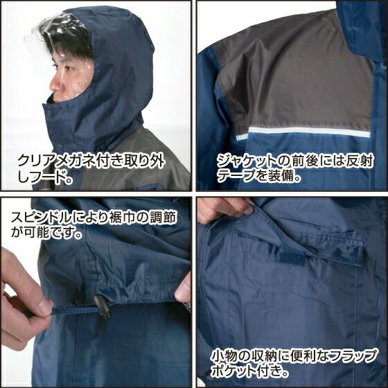 顔周りは視界を確保するため、フードを一部クリアタイプにしました。フードは取り外しできるので用途に合わせて使用できます。ジャケットの前後には反射テープがつているので、夜間の視認性も確保。パンツ裾はスナップボタンで幅を調節できるので、不要なバタつきを抑えられて安全です。