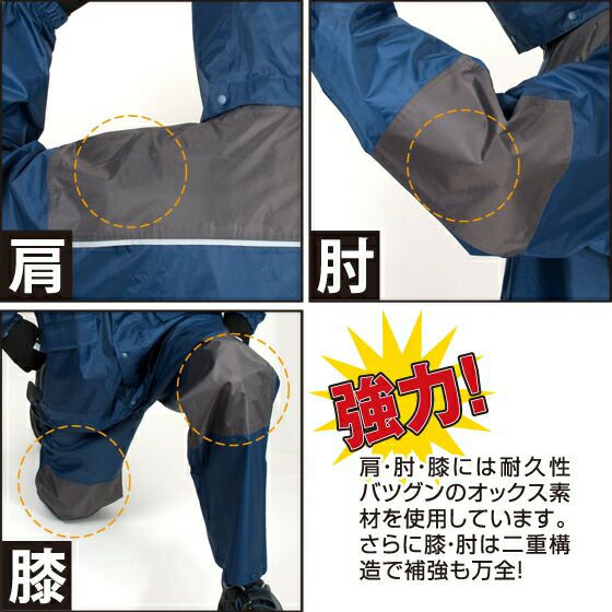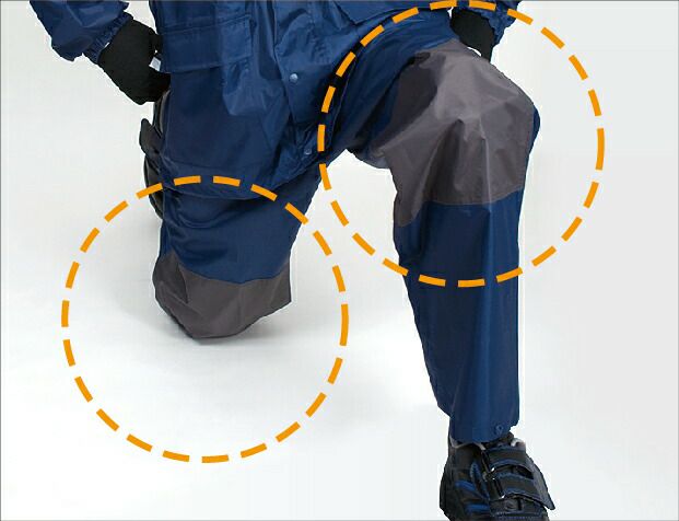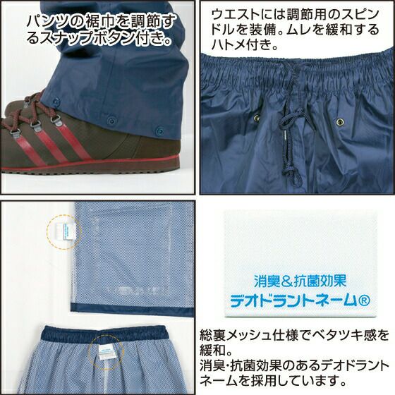 負荷がかかりやすい肩・肘・膝をオックス素材で補強し耐久性を高めました。ハードな使用環境、ハードな動きのシーンで実力を発揮します。またこのレインウエアは上下ともデオドラントネームを採用しているのも嬉しい機能です。デオドラントネームは、汗などのニオイや雑菌の繁殖を抑える消臭抗菌効果がありレインウエアを着て作業中に汗をかいた時も、この消臭機能があれば快適に作業できます。