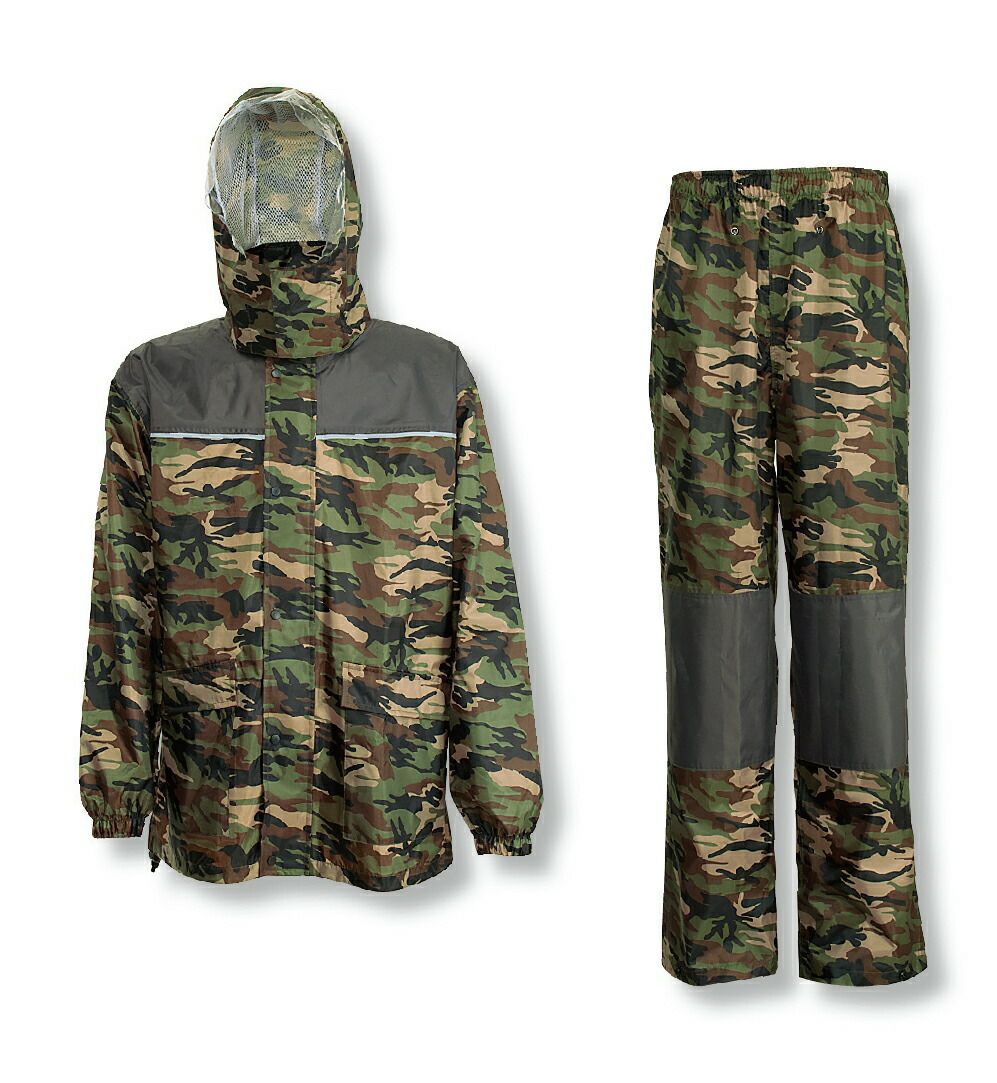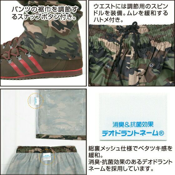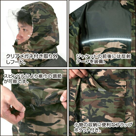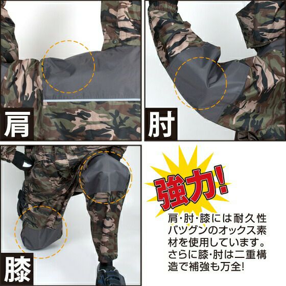 カモフラ(迷彩)柄のレインスーツ『レインストロングα』です。