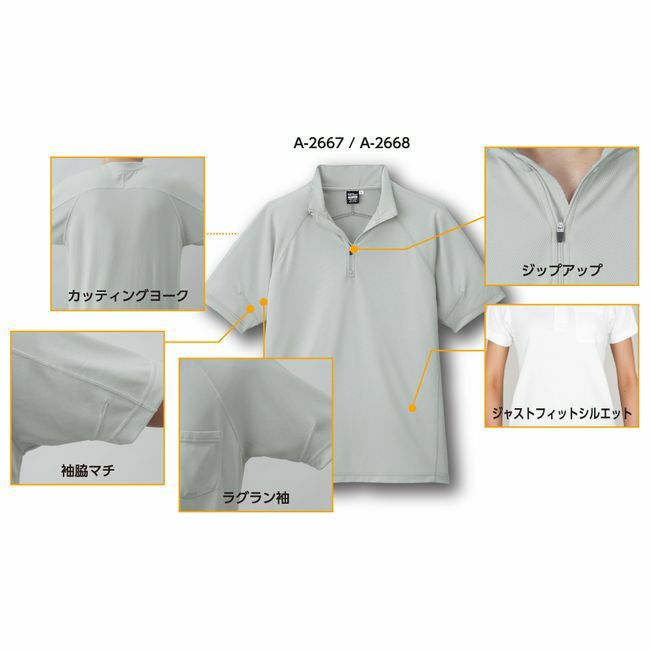 吸汗速乾×接触冷感の機能素材。汗を素早く吸収&拡散することで衣服内をドライに保ちます。 コーコス A-2667 冷感・吸汗速乾半袖ジップアップ