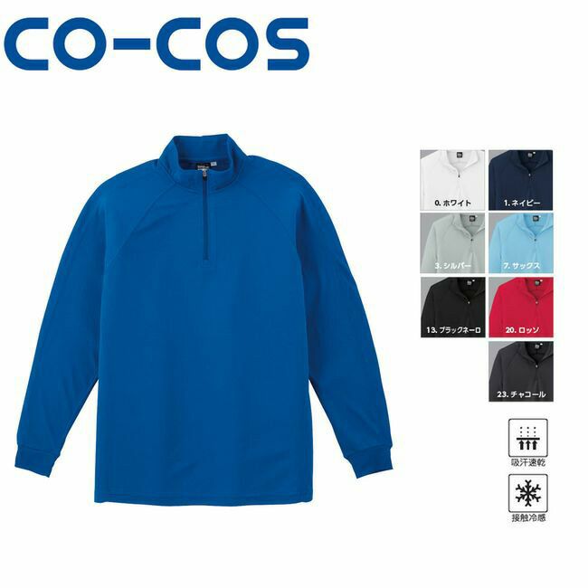 吸汗速乾×接触冷感の機能素材。汗を素早く吸収&拡散することで衣服内をドライに保ちます。 コーコス A-2668 冷感・吸汗速乾長袖ジップアップ