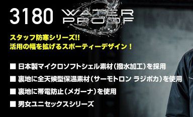 素材/表地 : マイクロソフトシェル、撥水加工 裏地 : 全天候型保温素材(サーモトロンラジポカ)、帯電防止(メガーナ)