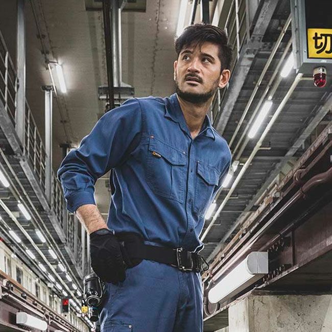 ワンウォッシュ加工を施し優しい肌触り。付属はYKKスナップを使用し、シンプルなデザインで幅広い業種に最適。