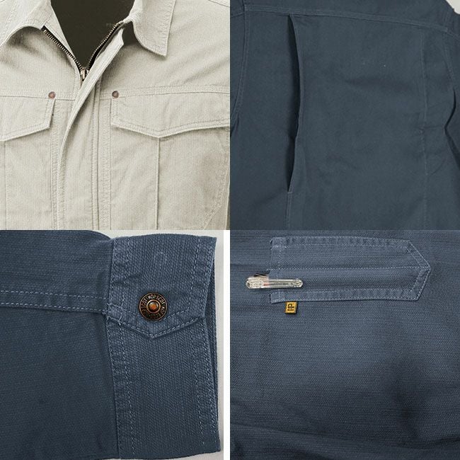 ワンウォッシュ加工を施し優しい肌触り。付属はYKKスナップを使用し、シンプルなデザインで幅広い業種に最適。