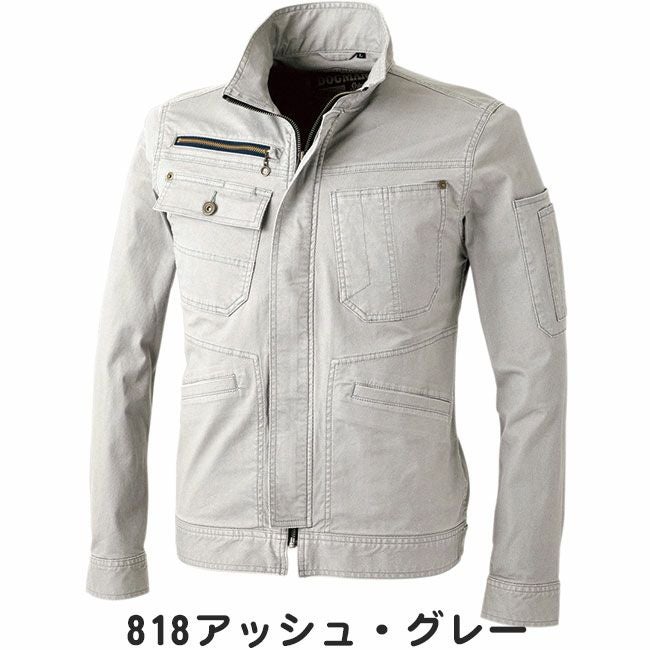 雰囲気を高めるマットな風合いと伸縮性を持った上質な素材使い。バイオ加工を施しソフトン肌触り、スタイリッシュなデザイン、すっきりとスマートなシルエットが印象的。130%ストレッチがアクティブな動きをアシストし、細身スタイいるでもストレスのない着用感の良さが光る。企業ユニフォームを視野にカーキにグレー、ネイビーブラックを取り入れたカラーバリエーション。ジャケット、パンツ合わせて15ポケットの大収納ポケット仕様。オリジナル刻印が施されたボタン、リベット。