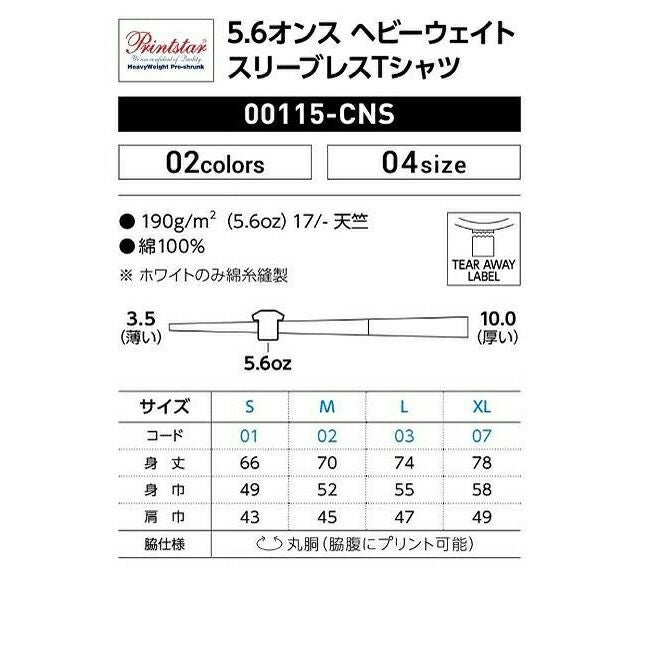 アクティブにもファッショナブルにもフィット広すぎないアームホールがスタイリッシュ 5.6オンス ヘビーウェイト スリーブレス Tシャツ Printstar プリントスター 00115