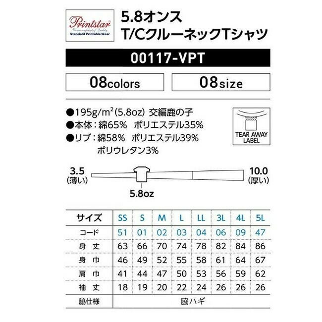ポロシャツで馴染深い鹿の子生地を採用したTシャツ 5.8オンス TCクルーネック Tシャツ Printstar プリントスター 00117