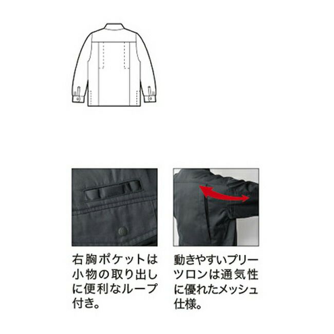 両胸のペン差し、右胸マルチポケット、内側に大型ポケットを装備した大容量収納ワークウェ