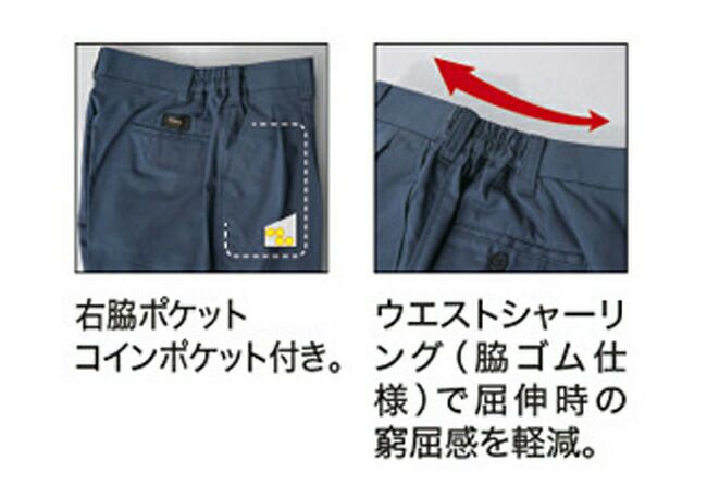 ソフトな風合いと伸縮性のある綿100%のウェザークロスに形態安定加工と防縮防シワ加工を施した綿100%作業服