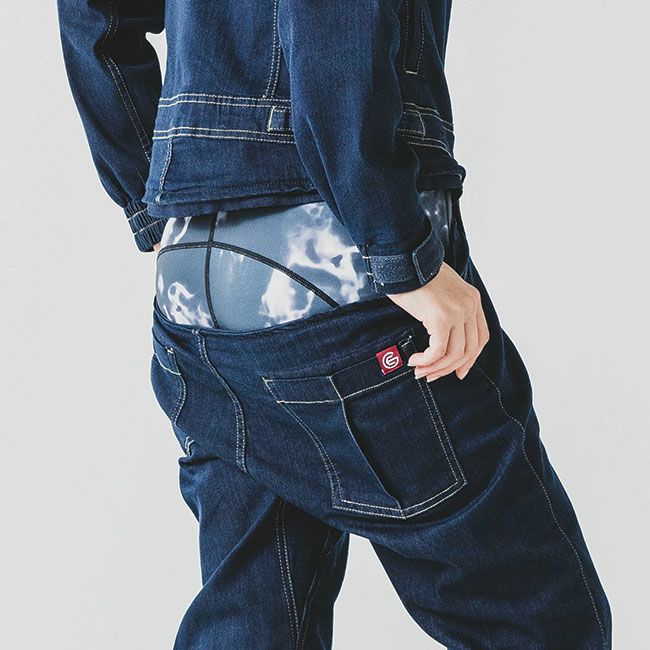 通常のコットンデニムより速乾性がある滑らかなこのデニム生地は、驚きのストレッチ性でウエストまで伸びる仕様です。