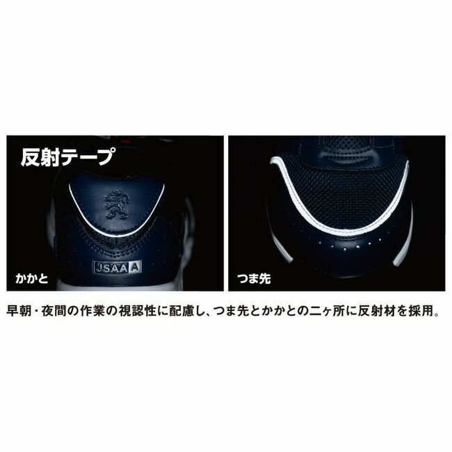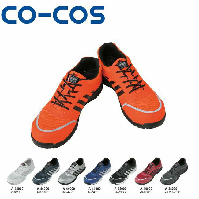 ビビッドカラーを中心に8色、サイズは22.5~30.0cmを展開し、女性から大柄な男性まで幅広くカバー。多色展開のA-4070シリーズとのコーディネートも可能。 コーコス A-44000 セーフティスニーカー 鋼製先芯 耐滑 反射 通気